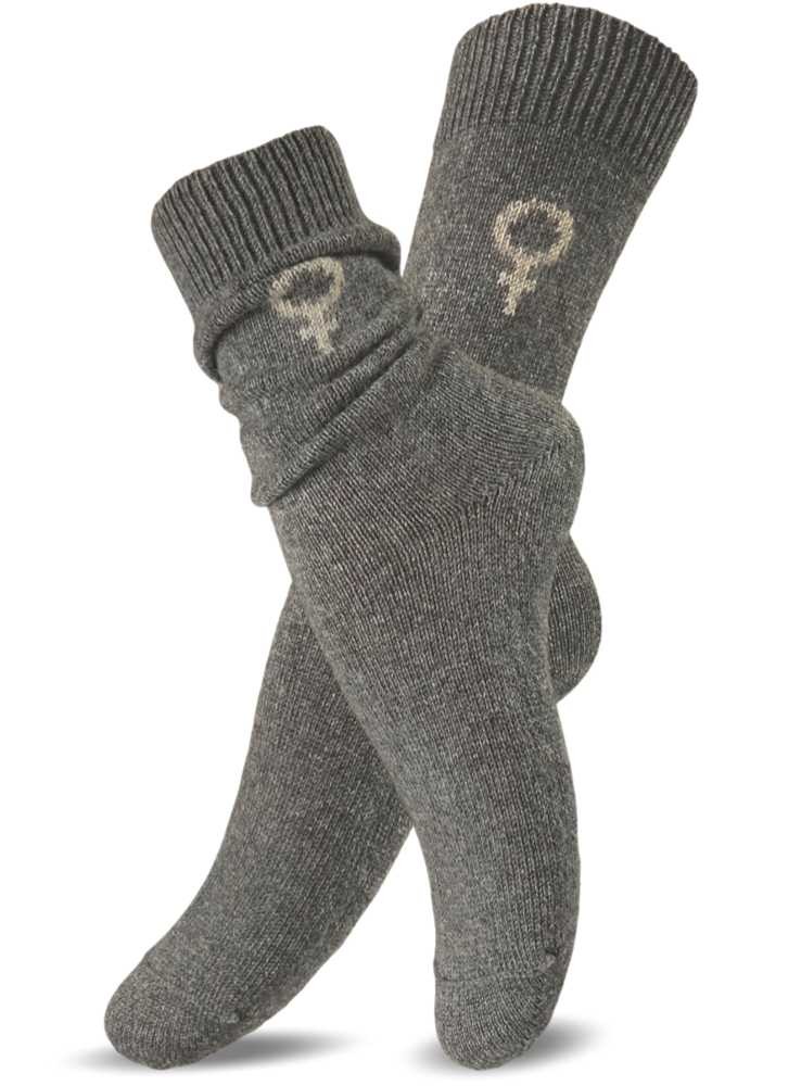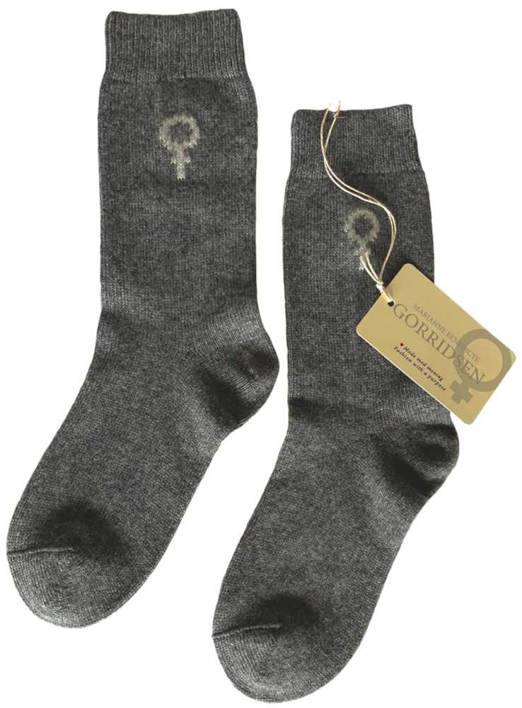 Uldstrømper Cashmere-mix fra Gorridsen. Lune og bløde uldsokker uden indvendige syninger. Uldsokkerne har det kendte kvindetegn, som Gorridsen Design ynder at bruge med henvisning til de peruvianske kvinder, som strikker deres Aplacatrøjer. Uldstrømperne er made in Italy, har ingen mærkbar søm i tåen, tynde nok til almindelige sko, eller brug dem som ekstra sokker, eller i stedet for hjemmesko