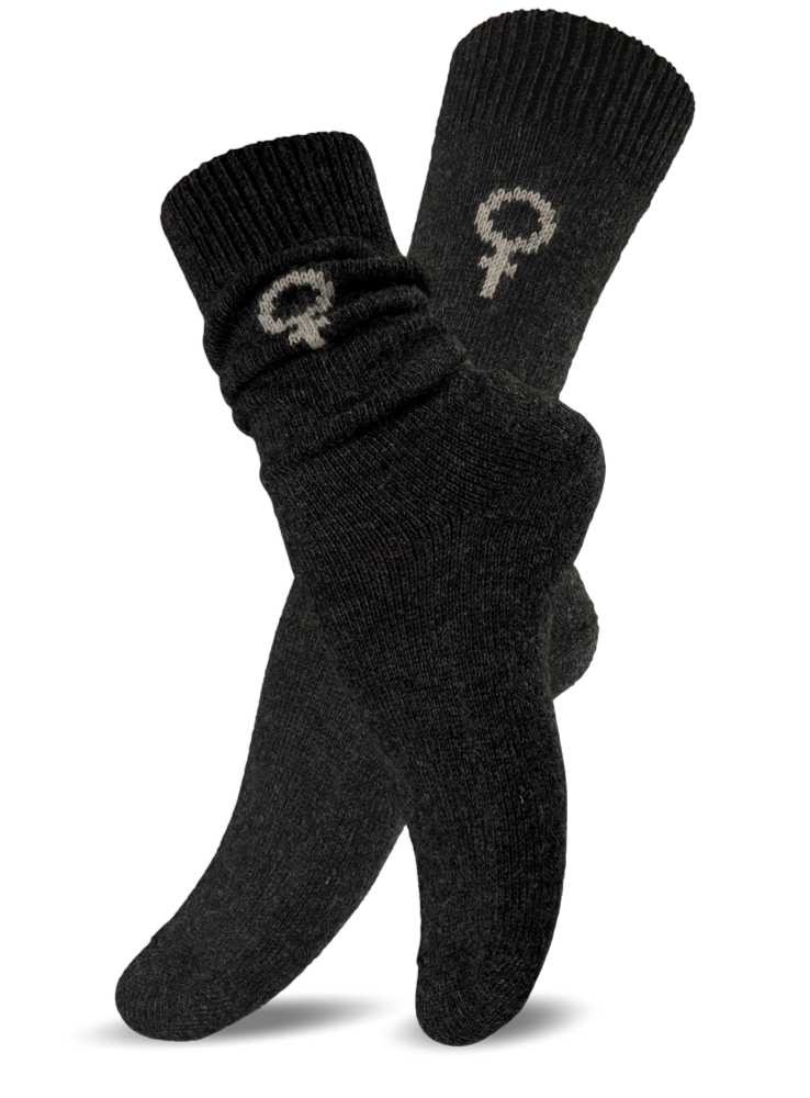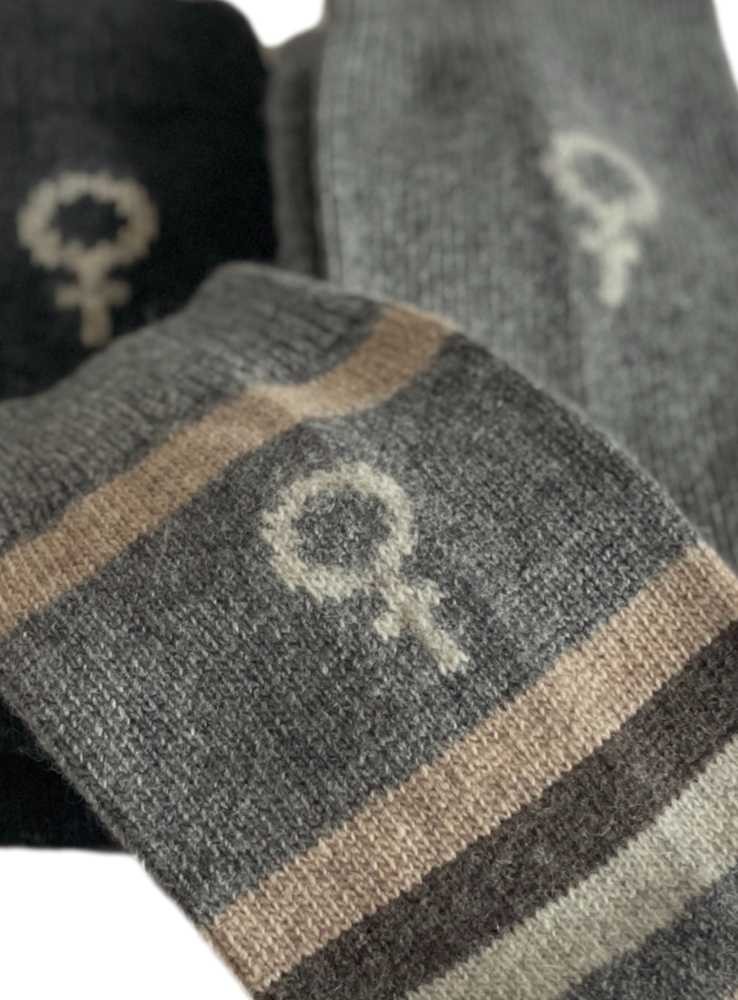 Uldstrømper Cashmere-mix fra Gorridsen. Lune og bløde uldsokker uden indvendige syninger. Uldsokkerne har det kendte kvindetegn, som Gorridsen Design ynder at bruge med henvisning til de peruvianske kvinder, som strikker deres Aplacatrøjer. Uldstrømperne er made in Italy, har ingen mærkbar søm i tåen, tynde nok til almindelige sko, eller brug dem som ekstra sokker, eller i stedet for hjemmesko