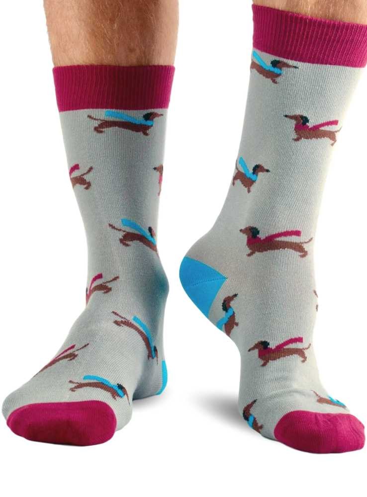 Bambus strømper med gravhunde på grå bundfarve. Håndketlet tå uden generende søm, og blød bred elastik som ikke strammer.